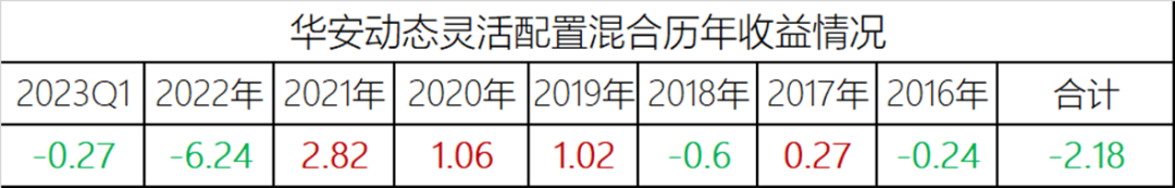 我们可以来测算一下,2016年三季度末,华安动态灵活配置混合的规模只有2.6亿。截至2023年一季度末,该基金规模为21亿,规模膨胀了7倍。2016年-2022年,该基金收益情况分别为-0.24亿元、0.27亿元、-0.6亿元、1.02亿元、1.06亿元、2.82亿元、-6.24亿元,2023年一季度,该基金亏损0.27亿元,