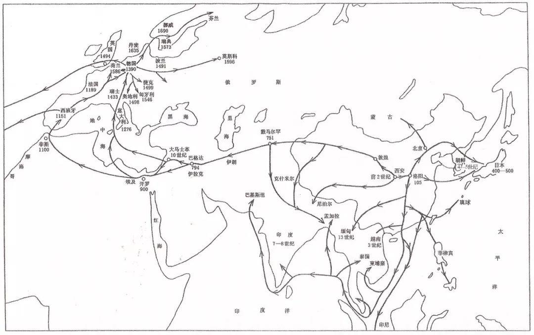 图2 中国造纸技术外传示意图(潘吉星绘)
