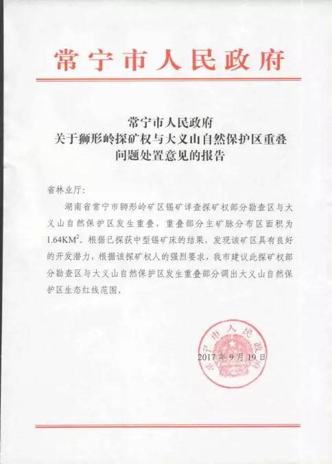 2017年9月,常宁市政府以文件形式向省林业厅请示:“根据已探获中型锡矿床的结果,发现该矿区具有良好的开发潜力,根据该探矿权人的强烈要求,我市建议此探矿权部分勘查区与大义山自然保护区发生重叠部分调出大义山自然保护区生态红线范围”。湖南省林业厅回复原则同意该建议。