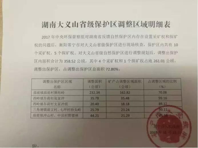 2017年9月,按照常宁市相关要求,拟调出保护区的面积扩大到358.52公顷,主要涉及为四个采矿权区域和一个探矿权区域。在该方案未征求衡阳市林业局和环保局意见的情况下,常宁市直报省直相关部门,该方案相继通过湖南省林业厅专家评审会和湖南省环保厅组织的自然保护区评审委员会评审。2018年4月23日,湖南省政府以文件形式复函通过调整。至此,常宁市三番五次申请调整保护区范围的目的终于实现。
