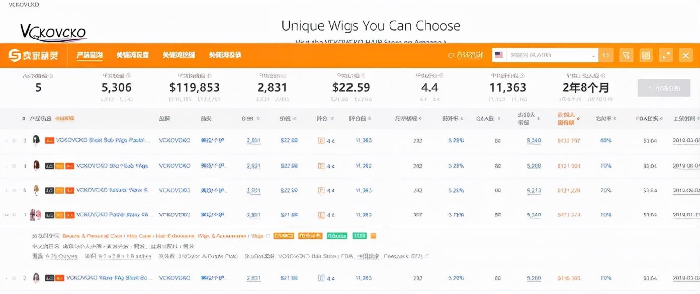 一份数据显示,亚马逊北美站排在前列的假发卖家是VCKOVCKO(