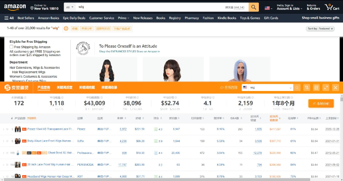 卖家精灵Sellersprite数据显示,亚马逊上有关“Wig”关键词的搜索结果超过2万条。