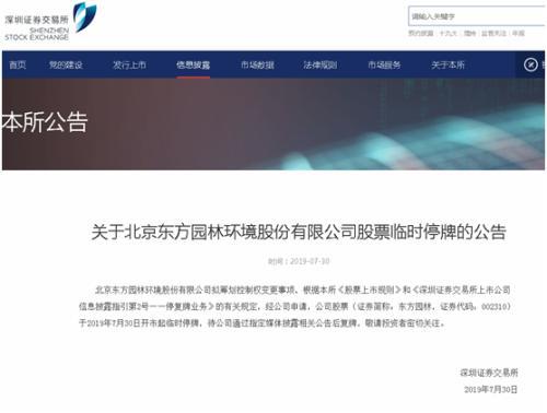 据深交所公告称,北京东方园林环境股份有限公司拟筹划控制权变更事项,根据相关规定,经公司申请,公司股票东方园林自2019年7月30日开市起临时停牌。