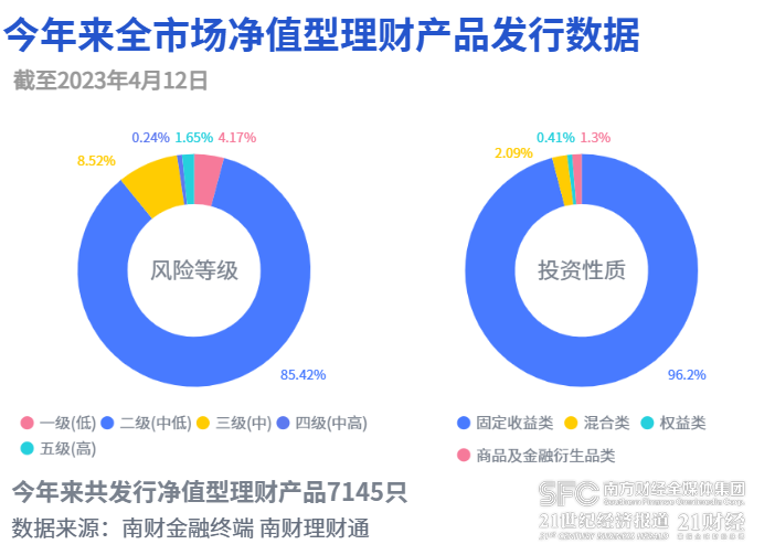 据南财理财通最新数据,截至4月12日,今年来全市场共发行净值型理财产品7145只。
