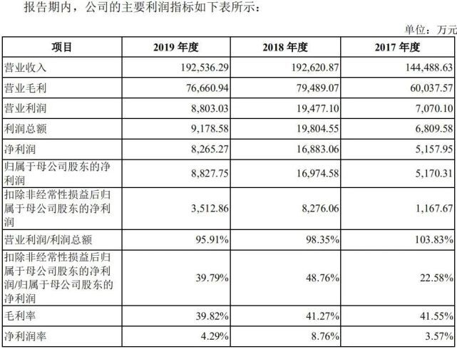 2017、2018和2019年度,公司营业收入分别为14.45亿元、19.26亿元和19.25亿元,归属于母公司股东净利润分别为5170.31万元、1.70亿元、8827.75万元。然而,扣除非经常性损益之后归属于母公司股东的净利润分别仅为1167.67万元、8276.06万元、3512.86万元,这意味着,报告期内非经常性损益对公司经营业绩影响较大。