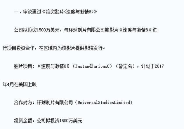 此外,中影也拟投资1500万美元,与环球制片有限公司就影片《速度与激情 8》进行项目投资合作,在区域内为该影片提供影院发行。