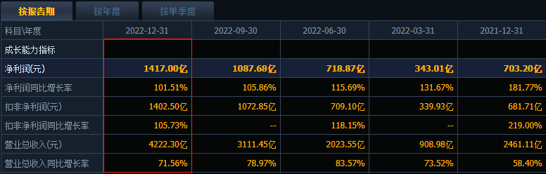 年报数据显示:公司在2022年实现营收4222.3亿元,同比增长71.56%,实现净利润1417亿元,同比增长101.51%;