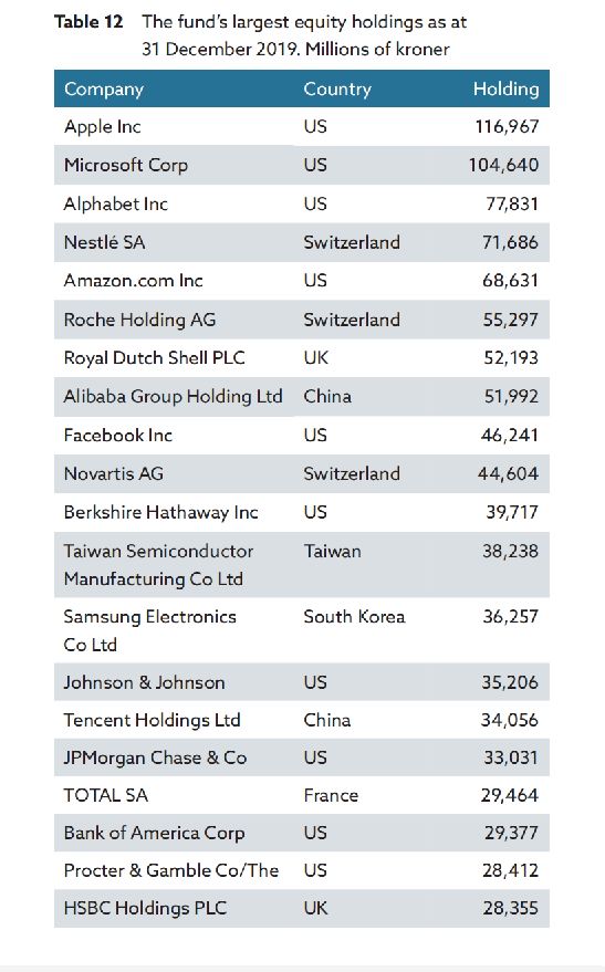 就个股来看,其前五大重仓股分别是,苹果、微软、Google母公司Alphabet、雀巢、亚马逊。其中,阿里巴巴排名第八,腾讯排名第15位,持仓量分别为519.92亿挪威克朗(约388.10亿元)、340.56亿挪威克朗(约254.22亿元)。