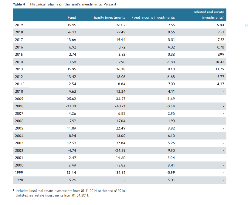 得益于2019年全球主要市场迎来大幅攀升,该基金的股权投资回报率达26.0%,上市及未上市房地产投资回报率为10.4%(非上市为6.8%),固定收益投资回报率为7.6%。