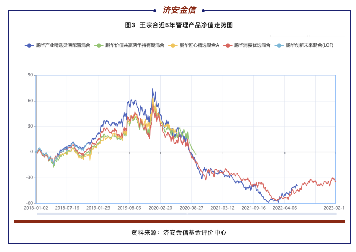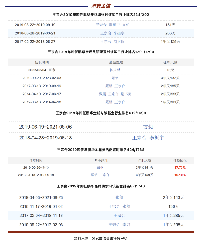 2019年,王宗合卸任鹏华安益增强、鹏华金城、鹏华金鼎灵活配置(A/C)、鹏华宏观灵活配置、鹏华品牌传承等5只(合并份额)产品基金经理就有着明显的“造星”痕迹。