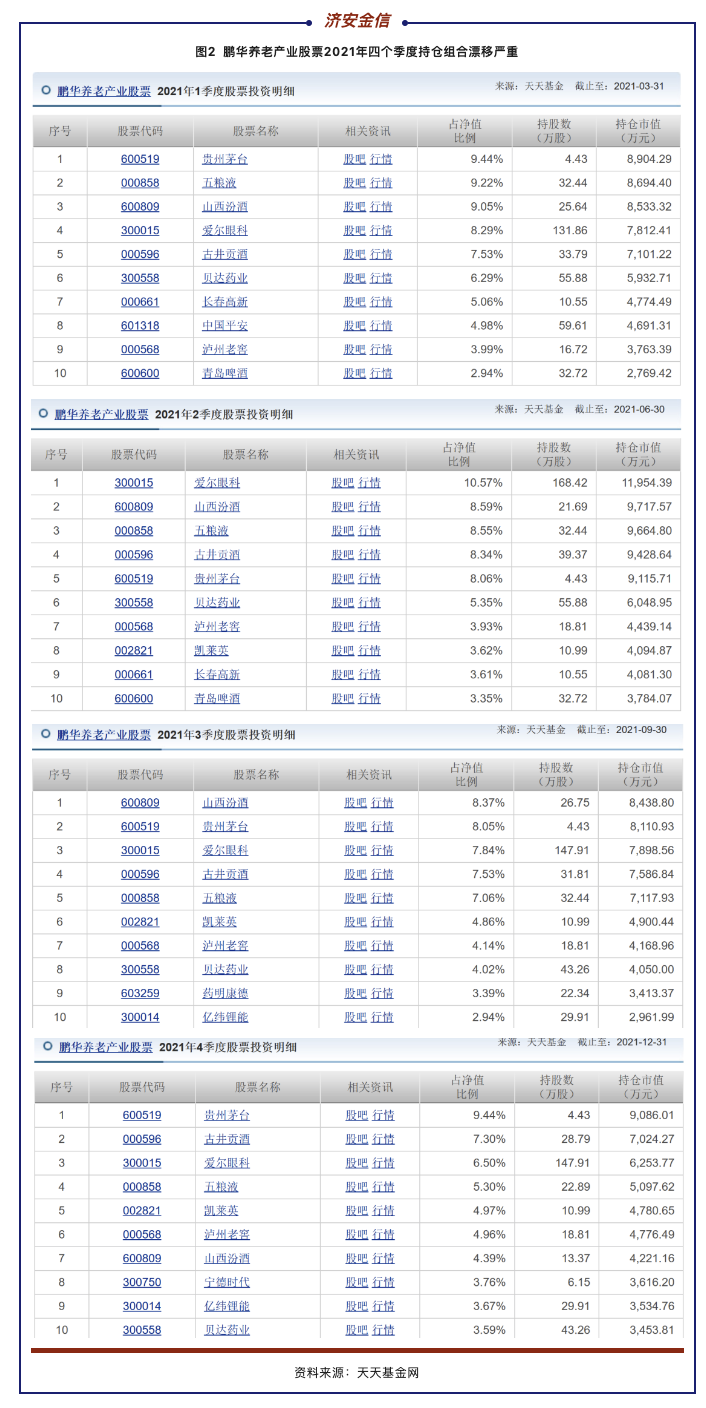该基金的契约风格描述为:投资于养老产业上市公司发行的股票占非现金基金资产的比例不低于80%。而纵观鹏华养老产业股票2021年持仓基本是白酒、啤酒和新能源,这种投资组合与契约风格要求的投资于养老产业上市公司发行的股票占非现金基金资产的比例不低于80%已经严重偏离。