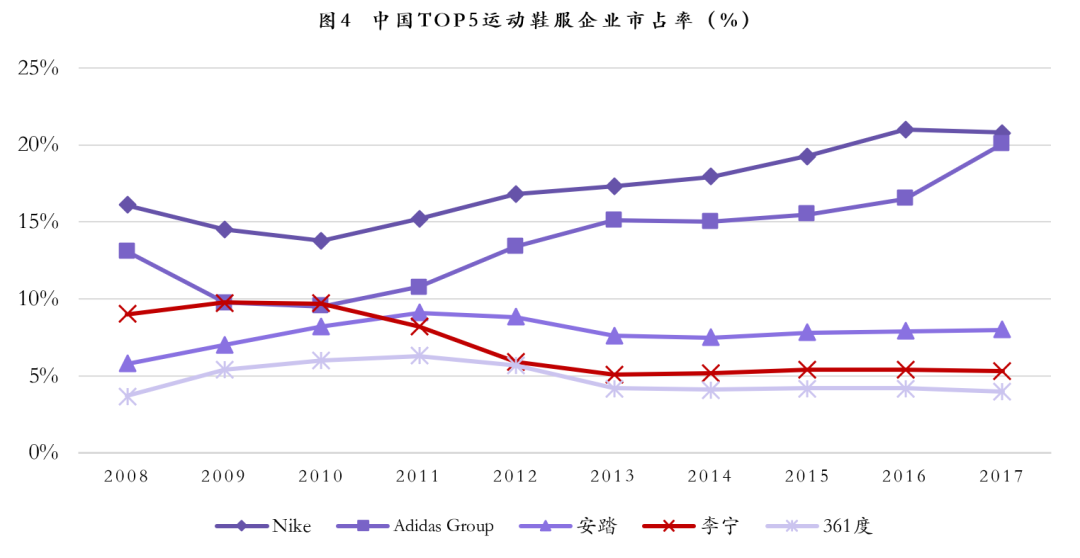 市场竞争格局也在行业的衰退和复苏中重新洗牌,形成了以耐克、阿迪为代表的国外品牌为第一梯队,市场占有率始终保持在前二;安踏凭借几年的稳定增长,成长为国内品牌第一,占据第二梯队;李宁经历零售改革后,业绩复苏,在第三梯队中努力追赶前者;特步、361度则处于第四梯队。