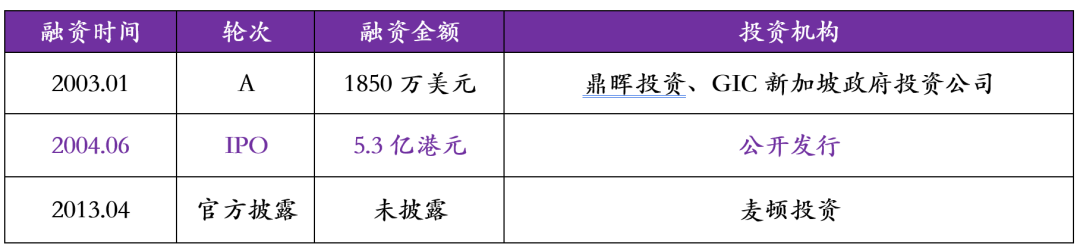 李宁公司因上市时间较早,当时国内创投市场尚处于起步阶段,因而在上市前仅经历了一轮融资,融资金额为1850万美元,投资机构为鼎晖投资和GIC新加坡政府投资公司。李宁公司于2004年在港股IPO,募资金额为5.3亿港元,2013年李宁公司又获得了麦顿投资的资金支持。