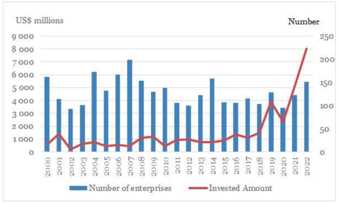 如上图所示,2022年韩国在美国的直接投资净额达284亿美元,比十年前增长了近五倍