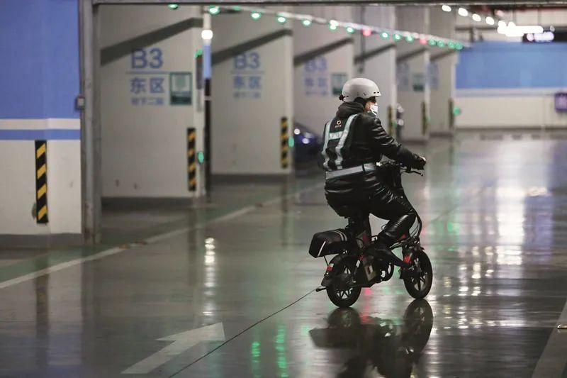 李晨骑着电动车,前往停车场去找下单代驾的客户。(摄影记者:张哲)