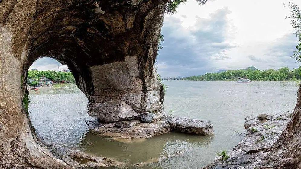 它坐落在桂林市中心的漓江与桃花江汇流处,形似一头巨象,象鼻和象腿之间是面积约一百五十平米的圆洞,江水穿洞而过,如明月浮水。坐落西岸的象山水月与漓江东岸的穿月岩相对,一挂于天,一浮于水,形成“漓江双月”的奇特景观。