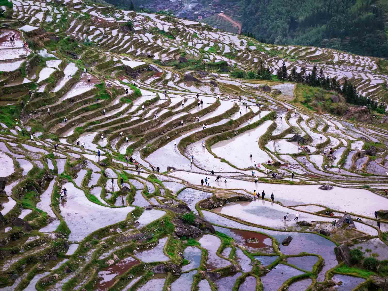 四月春耕,水满田畴,如串串银链山间挂;