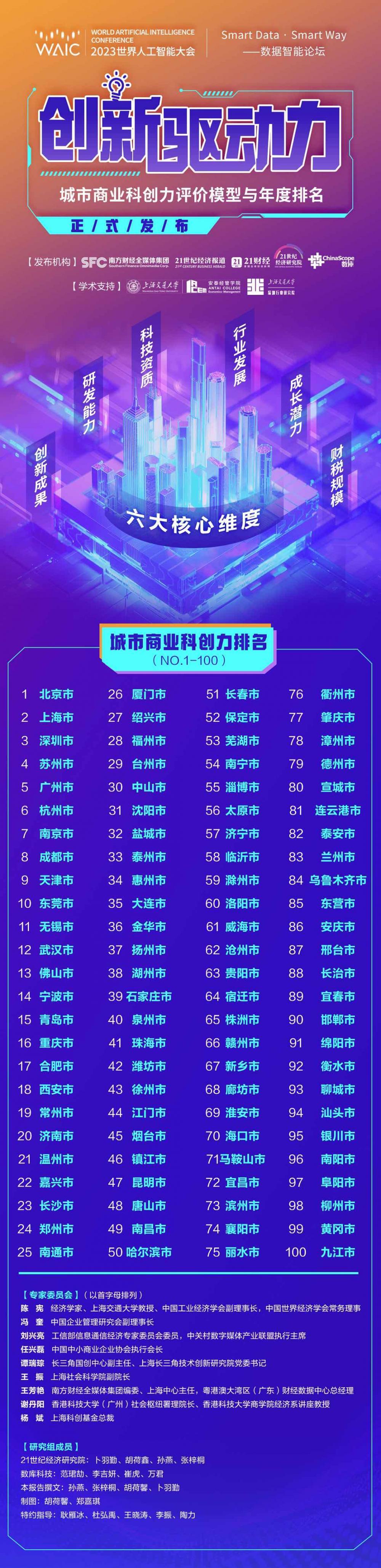 7月7日,21世纪经济研究院在世界人工智能大会(WAIC)数据智能分论坛上发布了《创新驱动力:城市商业科创力评价模型发布与年度排名》。