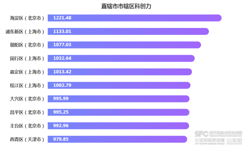 报告显示,四大直辖市中共有27个区进入TOP100,其中北京11个、上海11个、天津4个、重庆1个。前十位分别是:北京市海淀区、上海市浦东新区、北京市朝阳区、上海市闵行区、上海市嘉定区、上海市松江区、北京市大兴区、北京市昌平区、北京市丰台区和天津市西青区。