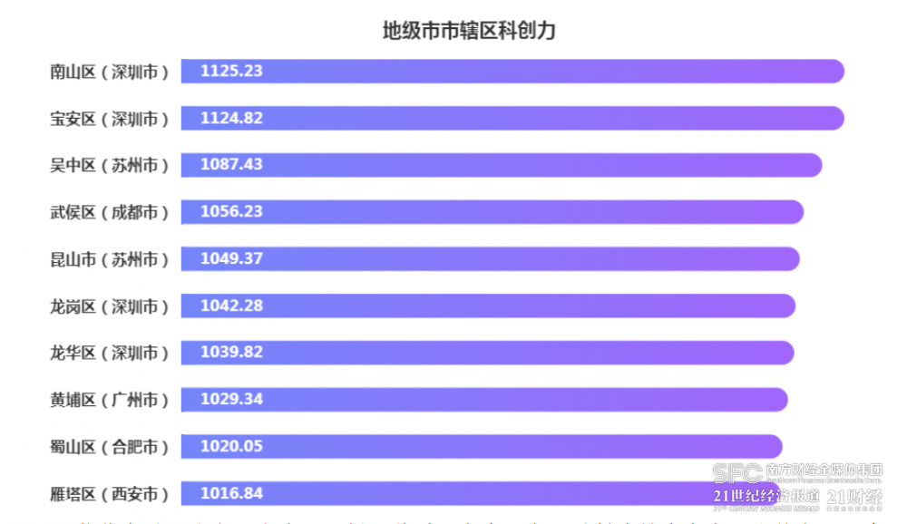 21世纪经济研究院注意到,若将两类区(市)对比来看,从总得分上,呈现出北京市海淀区、上海市浦东新区和深圳市南山区“三足鼎立”的态势;苏州市吴中区凭借苏州工业园区活跃的科创企业排名全国第5;作为“全国最强县级市”的苏州市昆山市,则是唯一一个跻身TOP10的县级市,总得分位列全国第8。