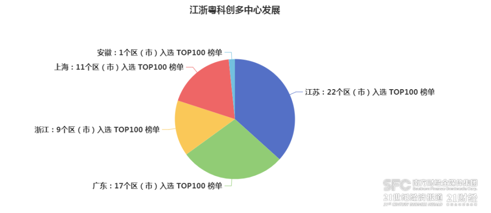 江苏省中,苏州、无锡、南京、常州、南通五市分别有8个、6个、5个、2个和1个区(市)入选TOP100;广东省中,深圳、广州两市集聚明显,分别入选7个和6个区,佛山入选2区,惠州、珠海也分别入选1区;浙江则是集中在杭州、宁波、温州三市,分别入选6个、2个和1个区。