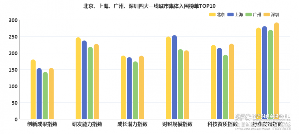 北、上、深、广四大一线城市集体入围TOP10。在六大维度中,北京获得了创新成果、研发能力、成长潜力三项评价维度第一,以总分1371.04位列第一;上海获得了财税规模单项评价维度第一,以总分1330.62位列第二;深圳获得了科技资质、行业发展两项评价维度第一,以总分1302.82位列第三;广州以总分1212.35位列第五。