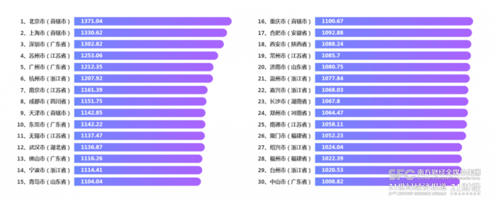 紧随TOP10,无锡、武汉、佛山、宁波、青岛、重庆、合肥、西安、常州、济南、温州、嘉兴、长沙、郑州、南通、厦门、绍兴、福州、台州、中山位列榜单第11至第30位。