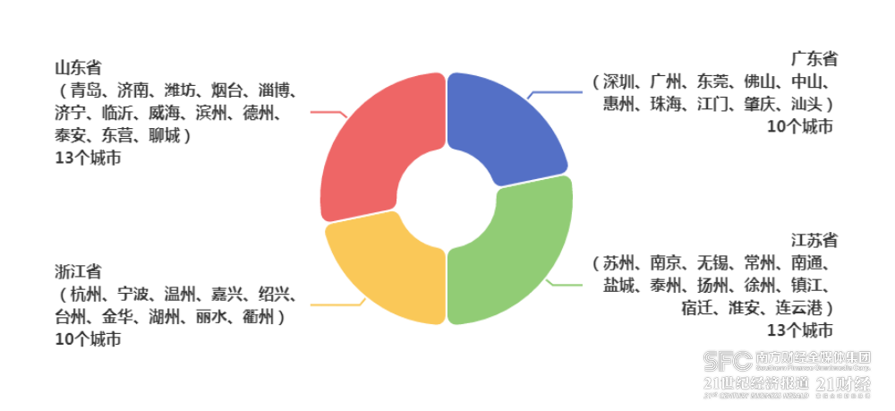 报告显示,上榜城市超过5个的省份共有6个:江苏省、山东省均有13个城市上榜,广东省、浙江省均有10个城市上榜,河北省有8个城市上榜,安徽省有7个城市上榜。