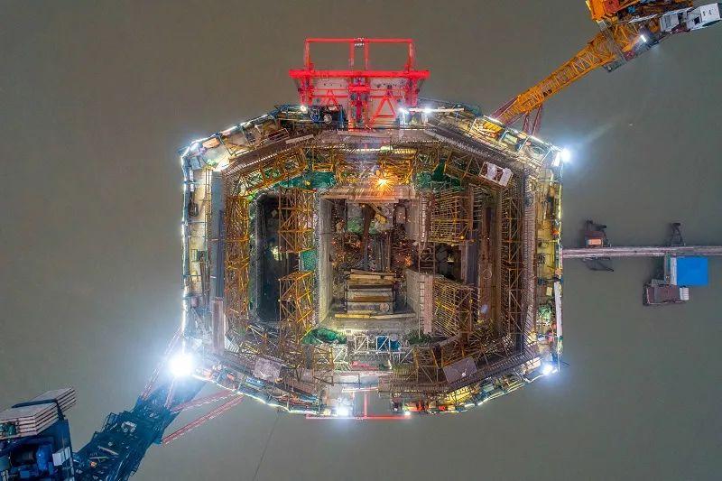 顾名思义,钢沉井就是桥墩的基础,即将一座巨型钢结构沉入江底后,再将几万立方米的混凝土浇灌入这个巨型钢结构的井壁。从空中俯瞰,其结构就像一块方形蜂窝煤。