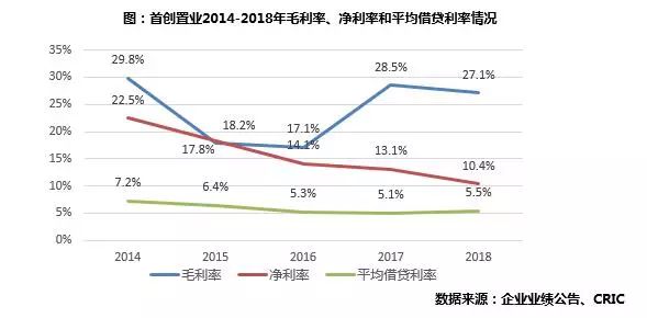 在融资成本普遍上升的情况下,首创2018年平均借贷利率为5.45%,同比上升0.38个百分点,在行业中仍处较低水平。这主要是凭借其国企背景,公司多元化融资渠道保持畅通,融资结构进一步优化,多渠道债券和保险融资占比提升,以及其背靠首创集团,能获得庞大的资金支持。2018年首创全面推进“首创2020”产品战略,完成两款高端产品线的的迭代升级和快速布局,且通过“3300”行动进一步提升成本管控标准化,房地产销售部分的利润率有所走高,从2017年的20.5%提升至25.2%。2018年首创置业整体毛利率为27.1%,同比下降1个百分点,主要是由于一级开发业务毛利率降低所致。