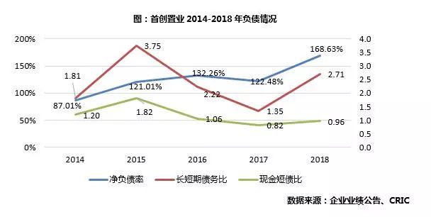 首创近年来净负债率一直上升,2018年为168.63%,虽然较17年上升46个百分点,高出房企平均60%-80%的安全值。且现金短债比小于1,现金未能完全覆盖短期债务。近年来拿地速度加快是首创债务上升的原因之一,但土储的增长并没有支撑其销售业绩的快速增长。值得一提的是,18年首创债务增多,主要是长期债务,长短债务结构优化。