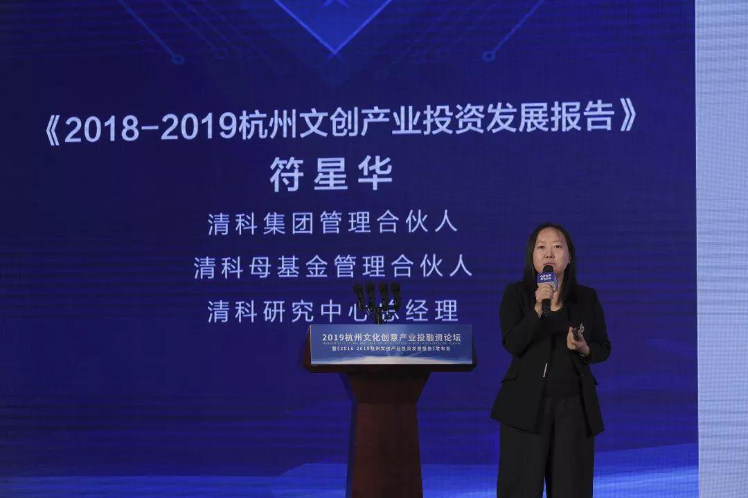 清科集团管理合伙人、清科母基金管理合伙人、清科研究中心总经理符星华在现场发布了由清科集团基于大数据分析完成的《2018-2019杭州文创产业投资发展报告》。