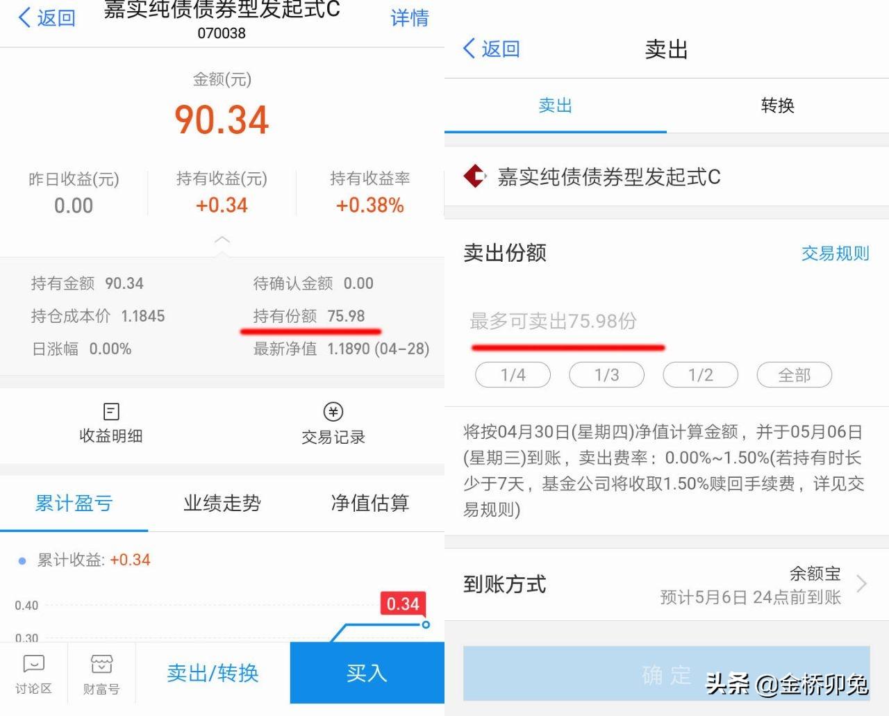 如上图,实际持有金额是90.34元,持有份额是75.98份,在执行卖出操作时看到的就是有些新手认为的“75.98”元。实际上基金持有金额等于基金净值份额数,只有基金买入时成交净值正好是1元时,不考虑手续费,基金持有金额才等于份额数。基金买入后,随着时间的延长,基金净值每日都是在根据当天交易市场涨跌情况发生变化的。但是份额数是持有该基金的份数,在确认后,如果没有分红,是不会变化的。持有金额和持有份额是两个概念,不能混淆。实际卖出时也是按当天公布净值份额在扣除手续费返回到余额宝账户中的。