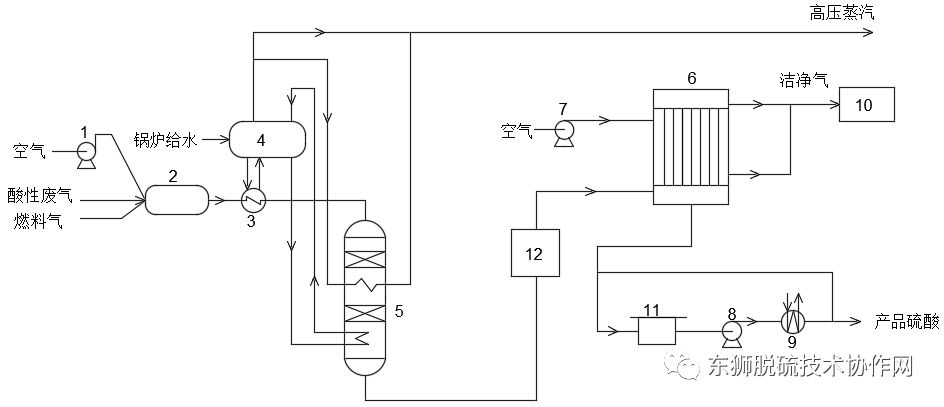 1/7.空气鼓风机;2.燃烧炉;3.余热锅炉;4.汽包;5.转化器;6.冷凝器;8.酸泵;9.酸冷却器;10.烟囱;11.硫酸贮槽;12.酸雾控制器