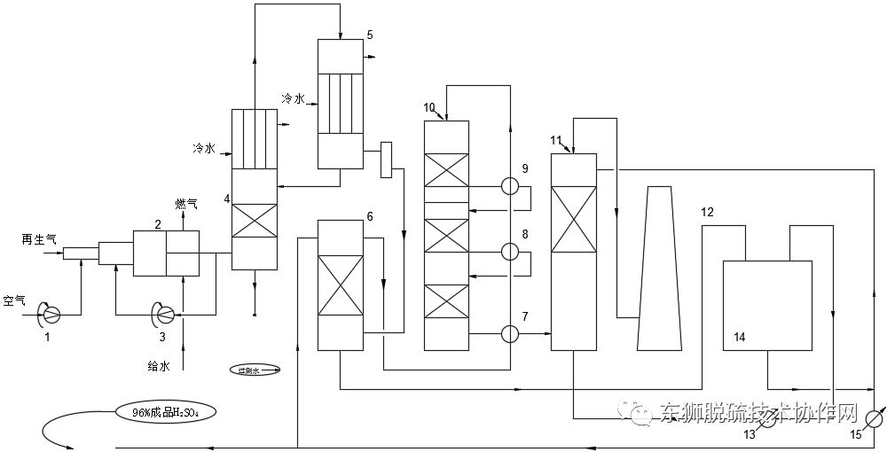 1.空气鼓风机;2.燃烧炉;3.燃烧气鼓风机;4.气体冷却器;5.气体过滤器;6.干燥塔;7.转化气/干燥气换热器;8.二段转化气/干燥气换热器;9.一段转化气/干燥气换热器;10.转化器;11.吸收塔;12.烟囱;13/15.冷却器;14.酸槽。