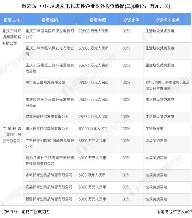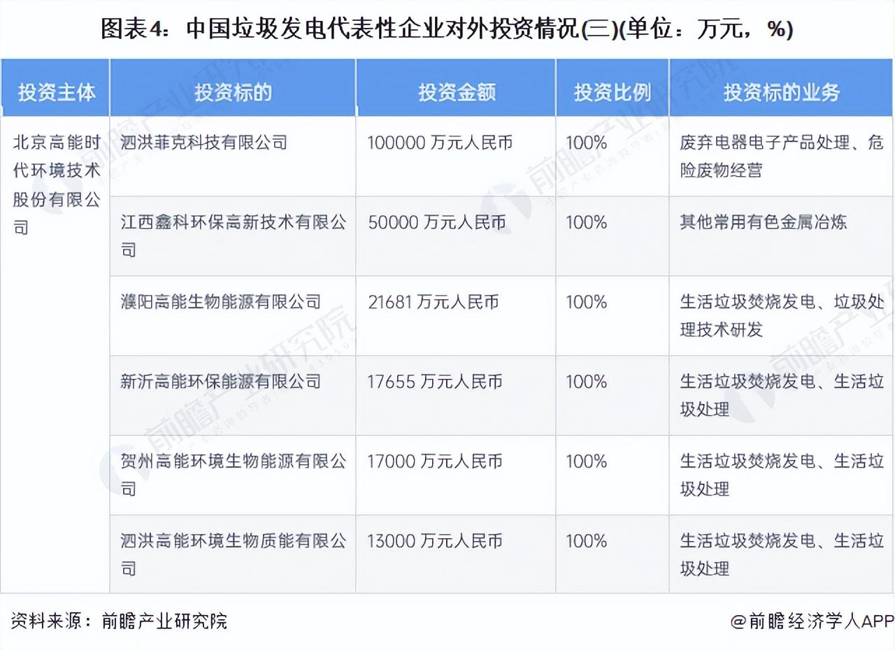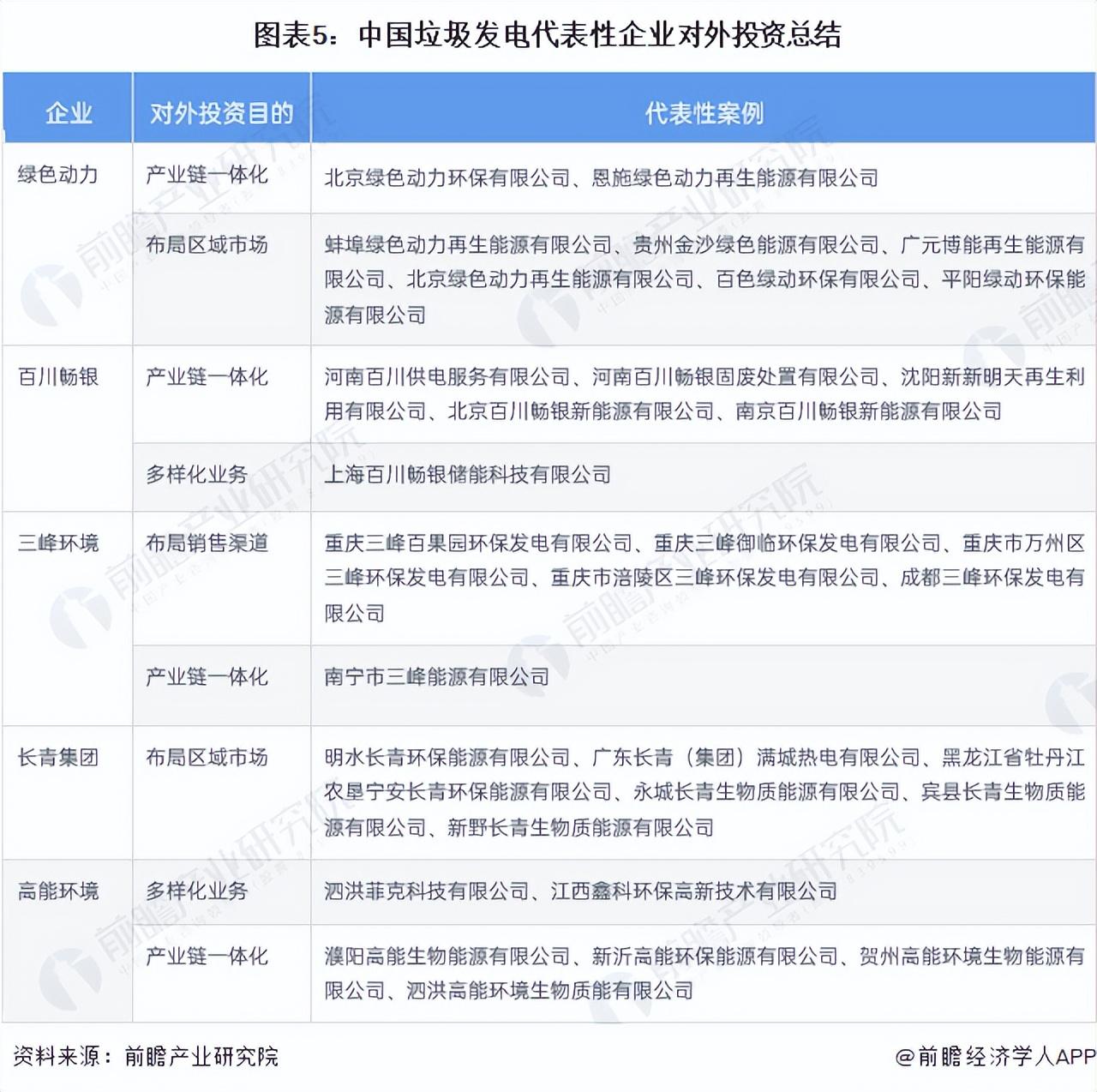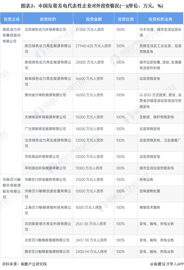 从中国垃圾发电代表性企业的对外投资来看,垃圾发电企业对外投资的企业多为设立子公司布局区域市场,同时把握产业链一体化布局,以便企业降本增效。