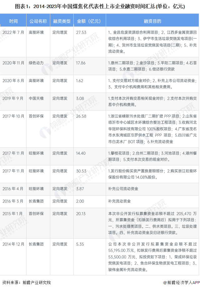 根据代表性上市企业公告的梳理,垃圾发电行业的上市公司融资手段主要通过定向增发方式进行。从整体来看,我国垃圾发电上市企业融资目的主要是用于项目扩增和补充流动资金等。近年来垃圾发电市场主要扩增方向有各个城市的生活垃圾焚烧发电项目。2014-2023年主要的融资事件如下: