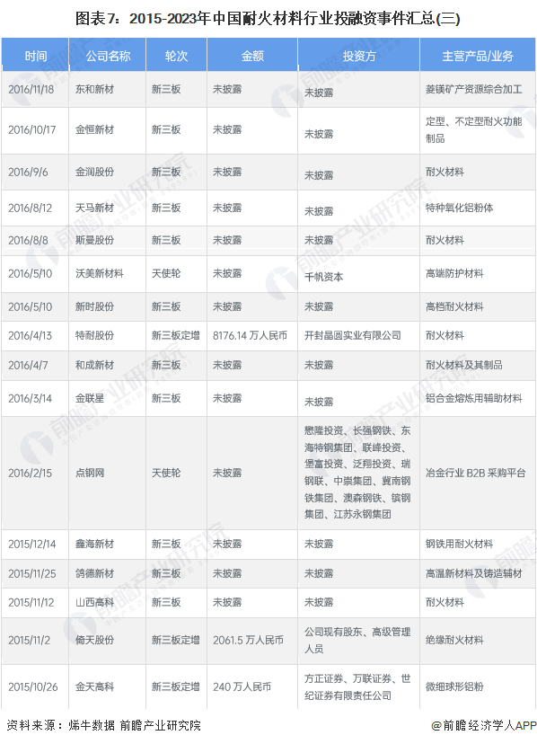 2、耐火材料行业投融资仍处于早期阶段