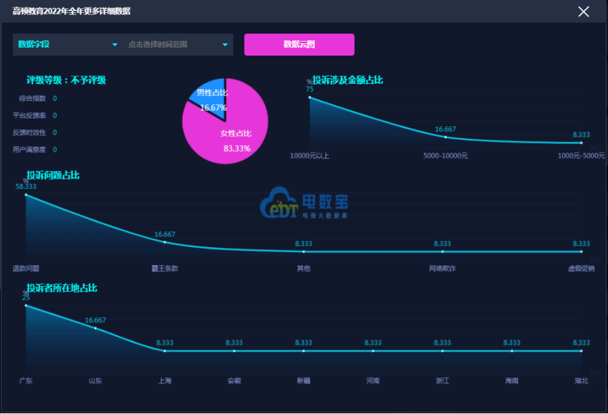 据网经社“电数宝”大数据库显示,在投诉“高顿教育”的用户中女性用户投诉比例为83.33%,男性用户投诉比例为16.67。