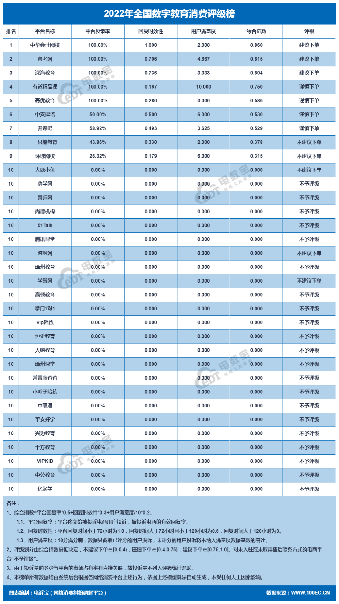 2022年全国数字教育平台消费评级榜依据运行十余年的第三方国内知名网络消费纠纷调解平台“电诉宝”(315.100EC.CN)在2022年受理的全国120家平台企业用户消费纠纷案例海量大数据得出,依据反馈率、反馈时效、满意度多项指标模型评估,其数据评级完全由系统自动生成独立、客观、公正。