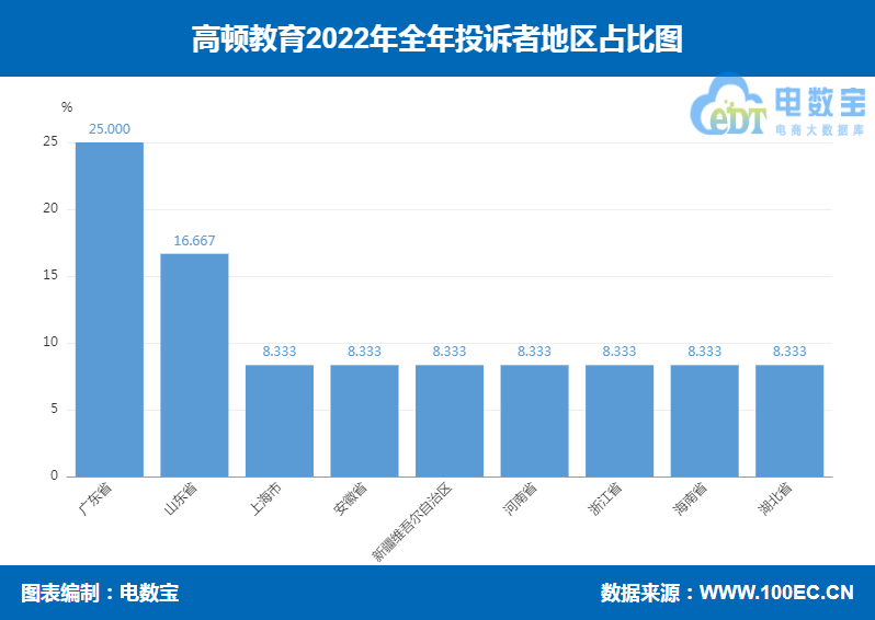 据网经社“电数宝”大数据库显示,2022年投诉“高顿教育”的用户主要集中地区依次为广东、山东、上海、安徽、新疆、河南、浙江、海南、湖北。