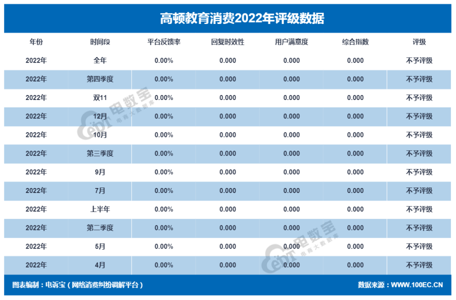 今天发布的是“高顿教育”电诉宝消费评级数据。据网经社旗下电商大数据库“电数宝”监测数据显示,2022年“高顿教育”共获得12次消费评级,其中12次获“不予评级”评级,2022 年整体消费评级为“不予评级”。